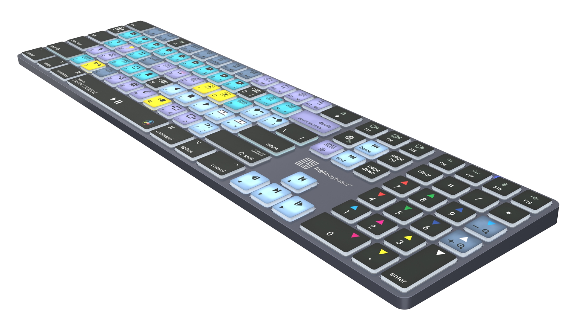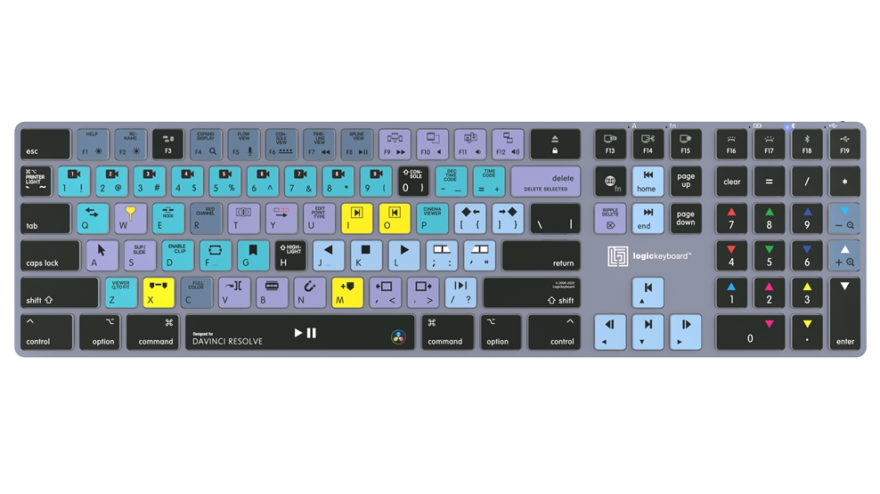 This Logickeyboard is your number one choice when editing in DaVinci Resolve. The shortcut commands labeled on the keys, and their color-coded definitions makes you a Master of controlling DaVinci Resolve in no time. The Logickeyboard is ideal for post-production facilities, professional editing houses, and everyone else working diligently with DaVinci Resolve.