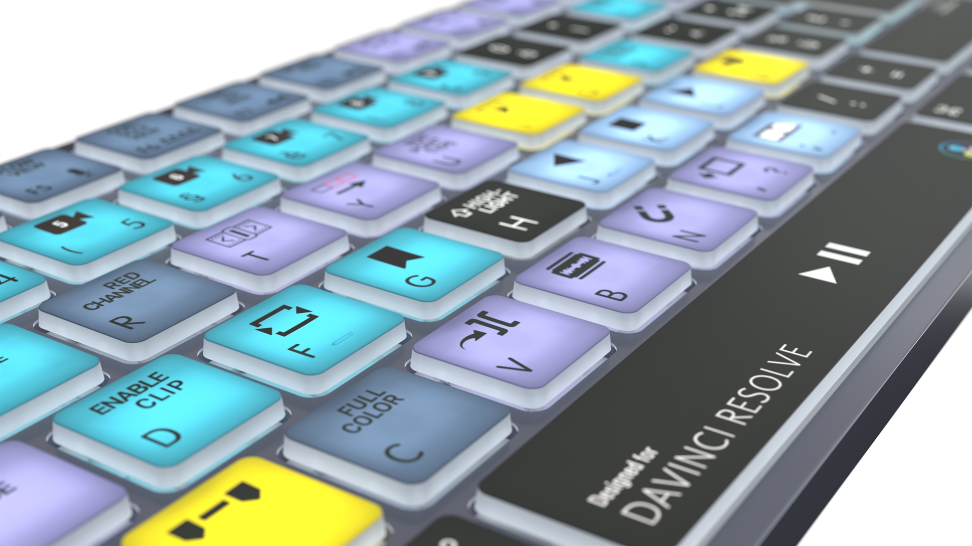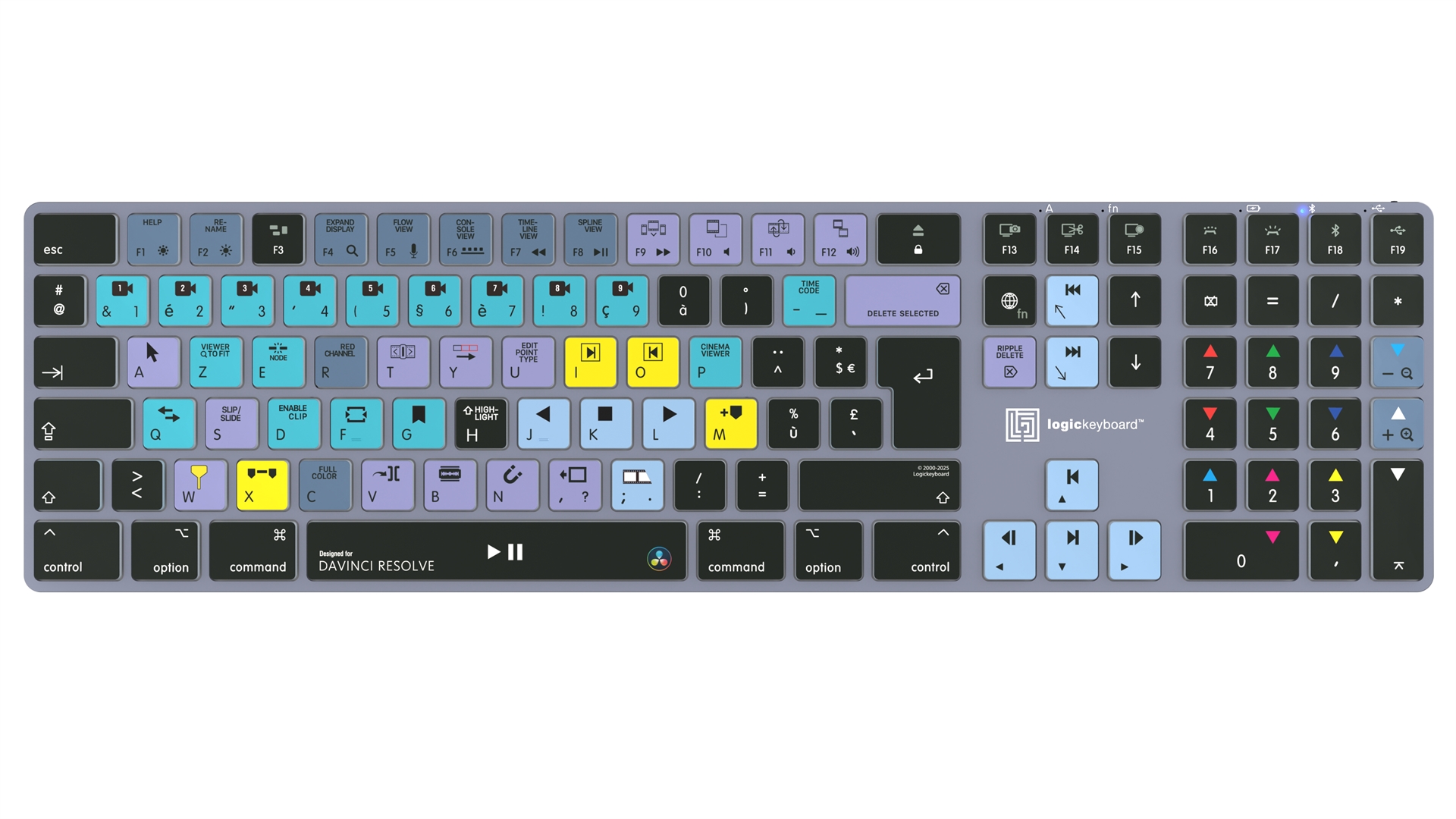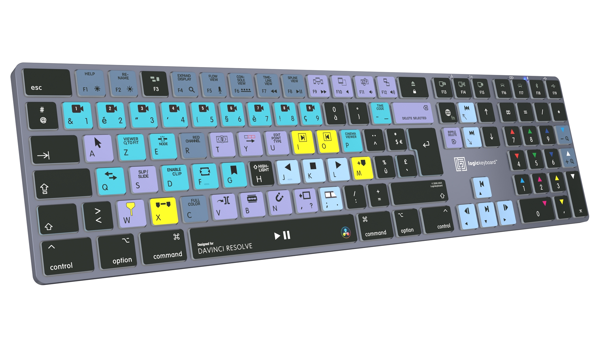 This Logickeyboard is your number one choice when editing in DaVinci Resolve. The shortcut commands labeled on the keys, and their color-coded definitions makes you a Master of controlling DaVinci Resolve in no time. The Logickeyboard is ideal for post-production facilities, professional editing houses, and everyone else working diligently with DaVinci Resolve.