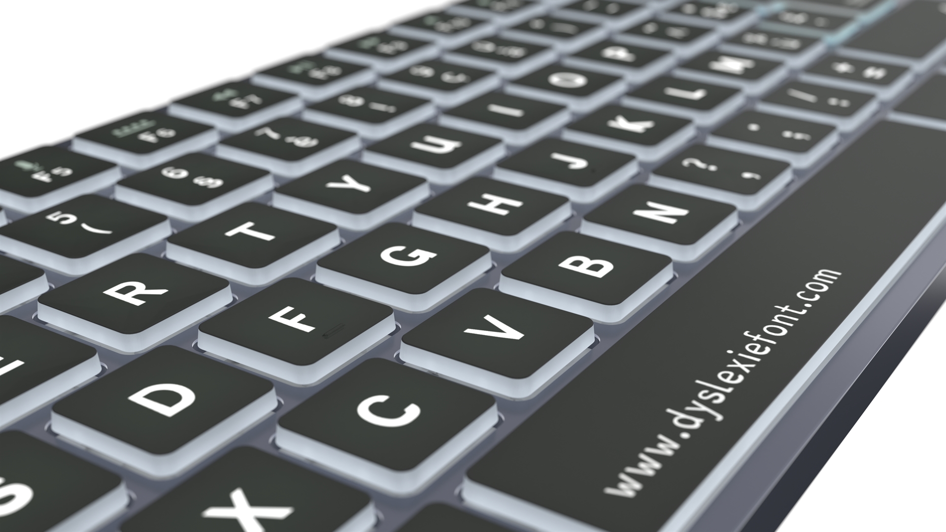 The keyboard font is developed in cooperation with www.dyslexiefont.com. Dyslexie Font incorporates subtle yet impactful modifications to traditional letterforms. Each character is meticulously crafted, featuring heavier bottoms, enlarged openings, and increased spacing. These design elements contribute to a more distinct visual contrast between letters, ultimately reducing the risk of confusion for dyslexic readers.